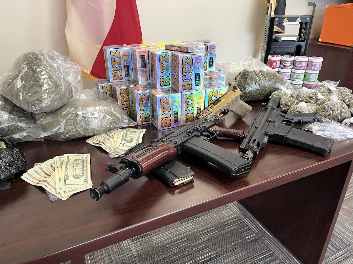 - Authorities also confiscated three firearms—an AK pistol, AR pistol, and a handgun—as well as approximately $1,000 in cash.