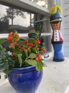 I use holly in outdoor displays. I cut some stems about 8″ to 10″ long, with and without berries, which I put in a pot next to a nutcracker made from terra cotta pots. I also save the lower branches cut from the bottom of my Christmas tree. I cut those back, wedge them into matching urns on either side of my side patio walls. Holly adds the perfect finishing touch. I water them well and try and keep them at least misted once a week and they always stay fresh.