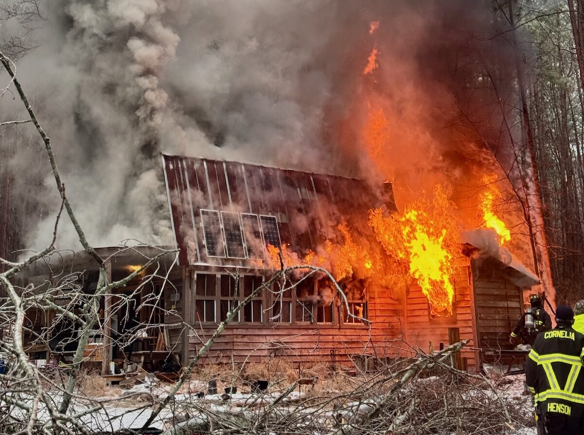 Firefighters accessed the scene on foot, carrying water cans, and attempted to contain what was initially a small compartment fire. With engines unable to reach the home, the fire continued to grow and ultimately became a fully involved structure fire.