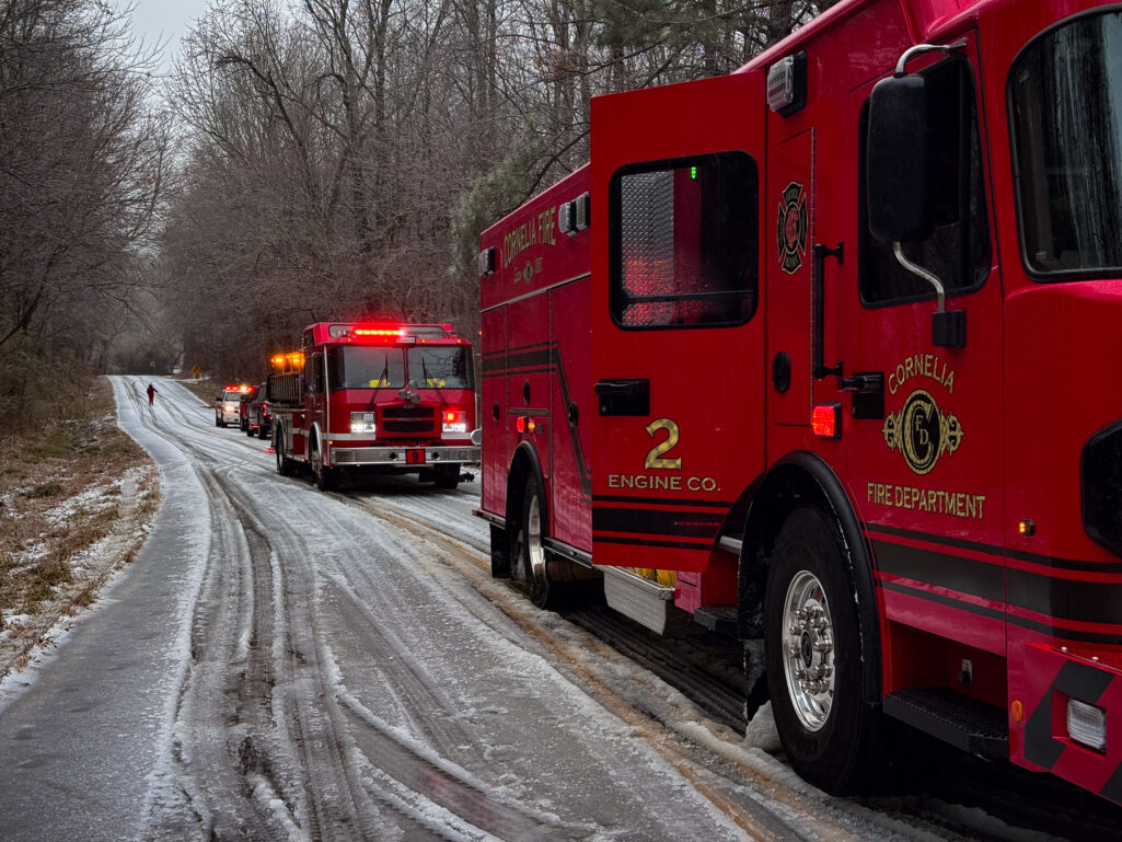 The Cornelia Fire Department’s F-150 brush truck was the only apparatus initially able to reach the scene, arriving after other units had been staged for more than 20 minutes due to icy road conditions. Habersham County Emergency Services later deployed its brush truck, leaving the two brush units as the only water-carrying apparatus on scene.