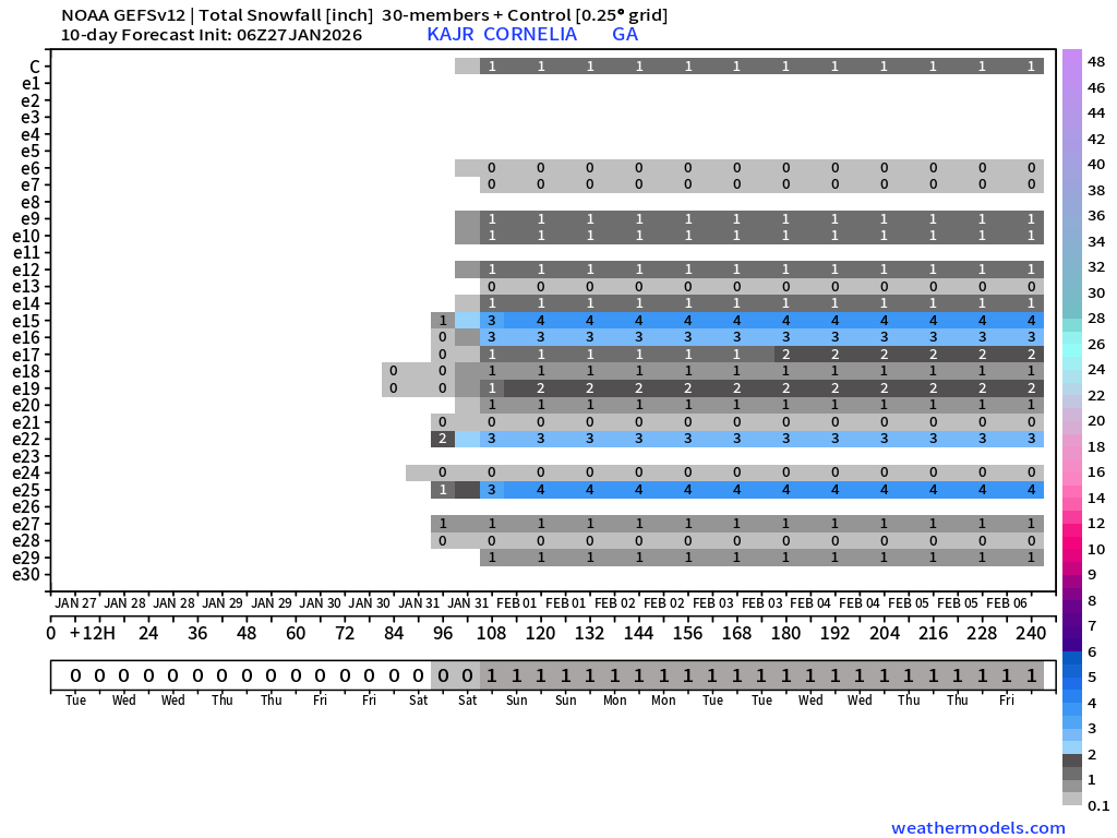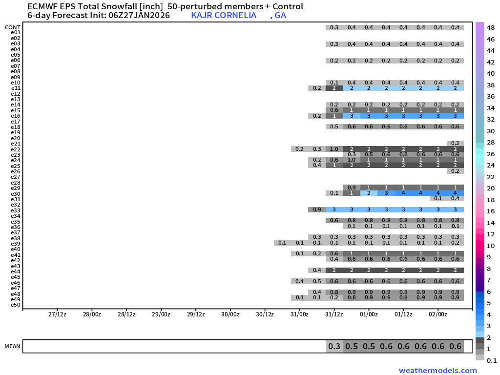 As you would expect, these charts also would produce radically different results on the ground as well. A solution like the one on the left with a stronger/further south upper system would result in light snow across mainly Northeast and East-Central Georgia. We’re talking 2-4″ at most, here, so nothing significant but definitely some potential for a nice little quick hitting system. The one on the right? Well, just some high clouds and maybe a flurry.
