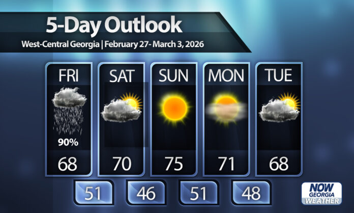Sunshine is going to take just a bit longer to return than earlier thought with the front stalling close enough to us to keep some clouds around through Saturday. Highs will return to around 70º, though, and we’ll be in the mid-70s by Sunday with sunshine finally back.