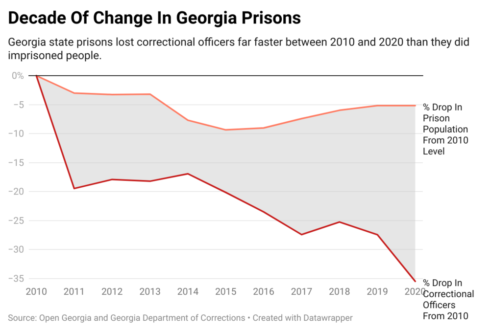 We’ll never know if the strike was truly the last straw, but the record one-year loss of employees after the labor strike — over 2,000 by 2011 — has not been repeated in state data since. It would take another nine years for Georgia Corrections staffing levels to fall to the level posted that year.