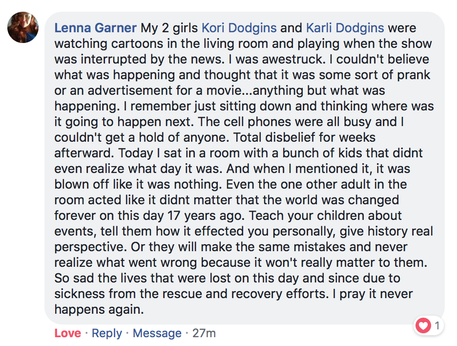 “They cancelled class for the rest of the day, and I’m sure I went home scared for our country and trying to process what was happening,” she writes. “It’s only as we’ve remember(ed) over the years that I truly understood the devastation that took place that day!”