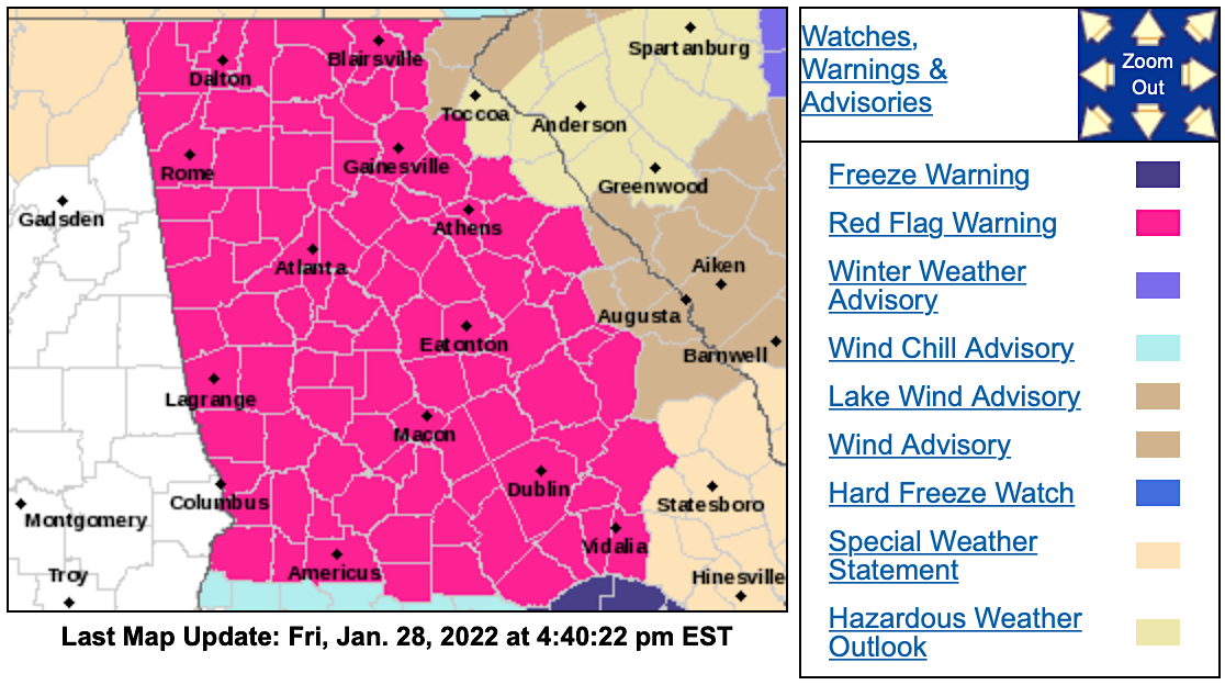 A Red Flag Warning is now in effect for North and Central Georgia from 12 Noon until 7 p.m. Saturday. Forecasters say low relative humidity and high winds will make outdoor burning dangerous.