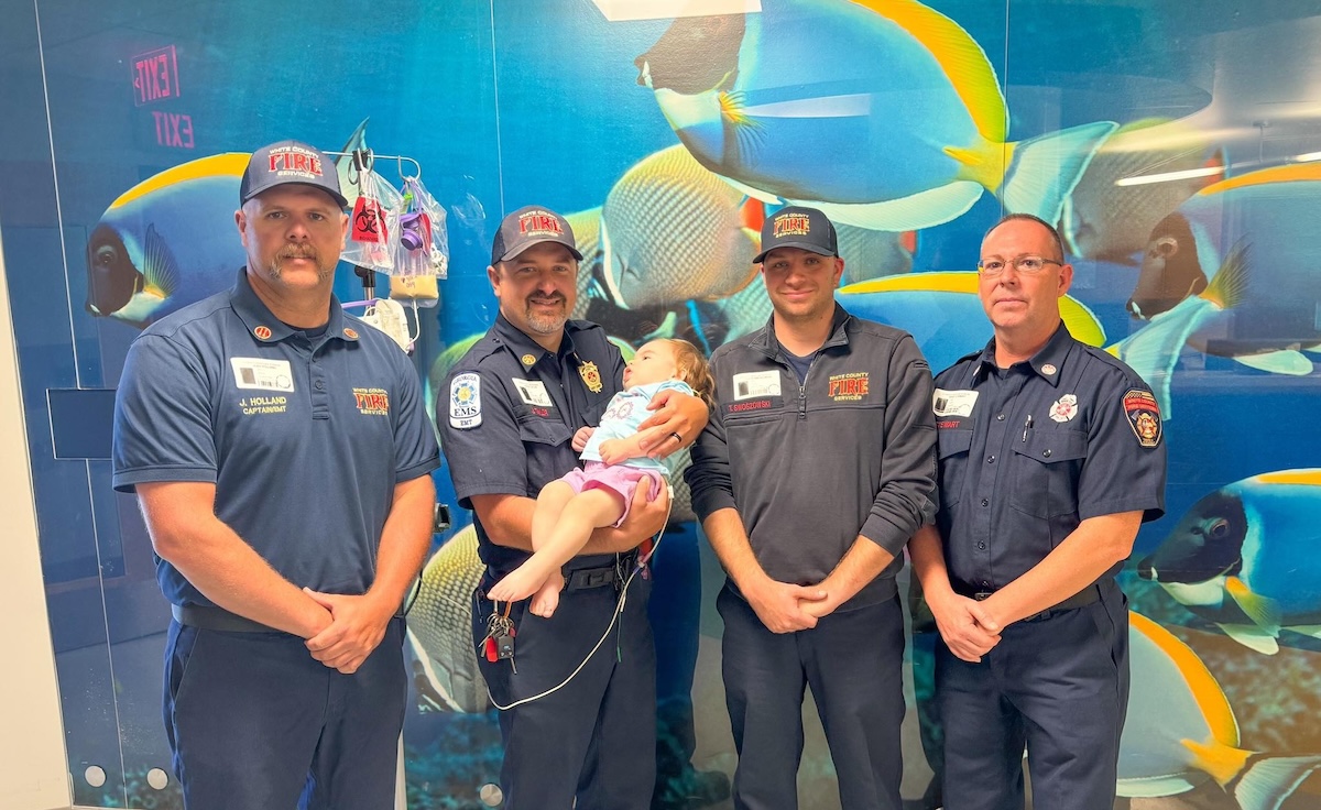 White County firefighters with Ari, whose life they helped save after a drowning incident on March 5, 2025. White County Asst. Fire Chief Josh Taylor is pictured holding the toddler. With them are, from left, Captain Jody Holland, and firefighters Trace Swoszowski and Terry Stewart. (White County Public Safety)