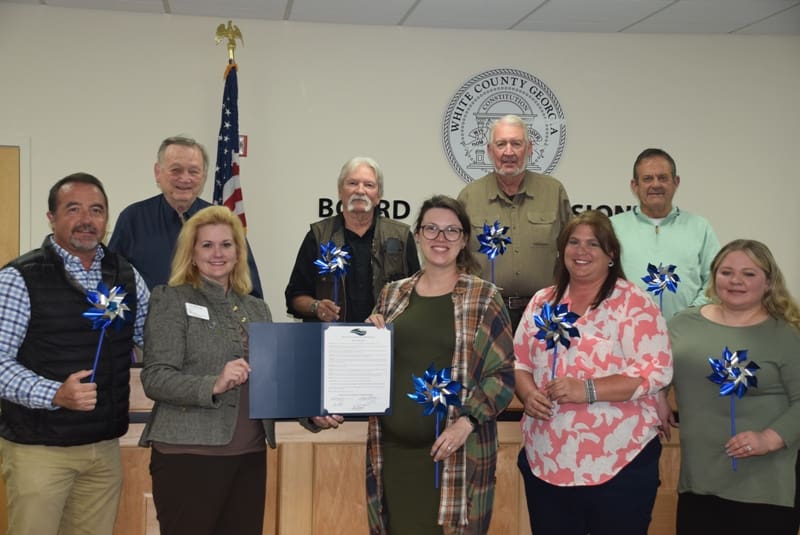 Representatives of South Enotah Child Advocacy, White County DFAS, and Enota CASA accept the Child Abuse Prevention Month proclamation from county commissioners. (Dean Dyer/WRWH Radio)