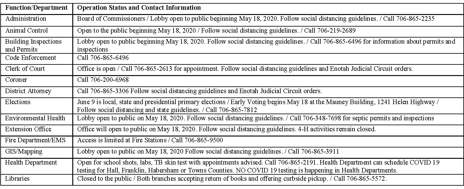 Below is a list of White County operations and their current operating status. County officials say this schedule may change at any time as the situation with COVID-19 develops.