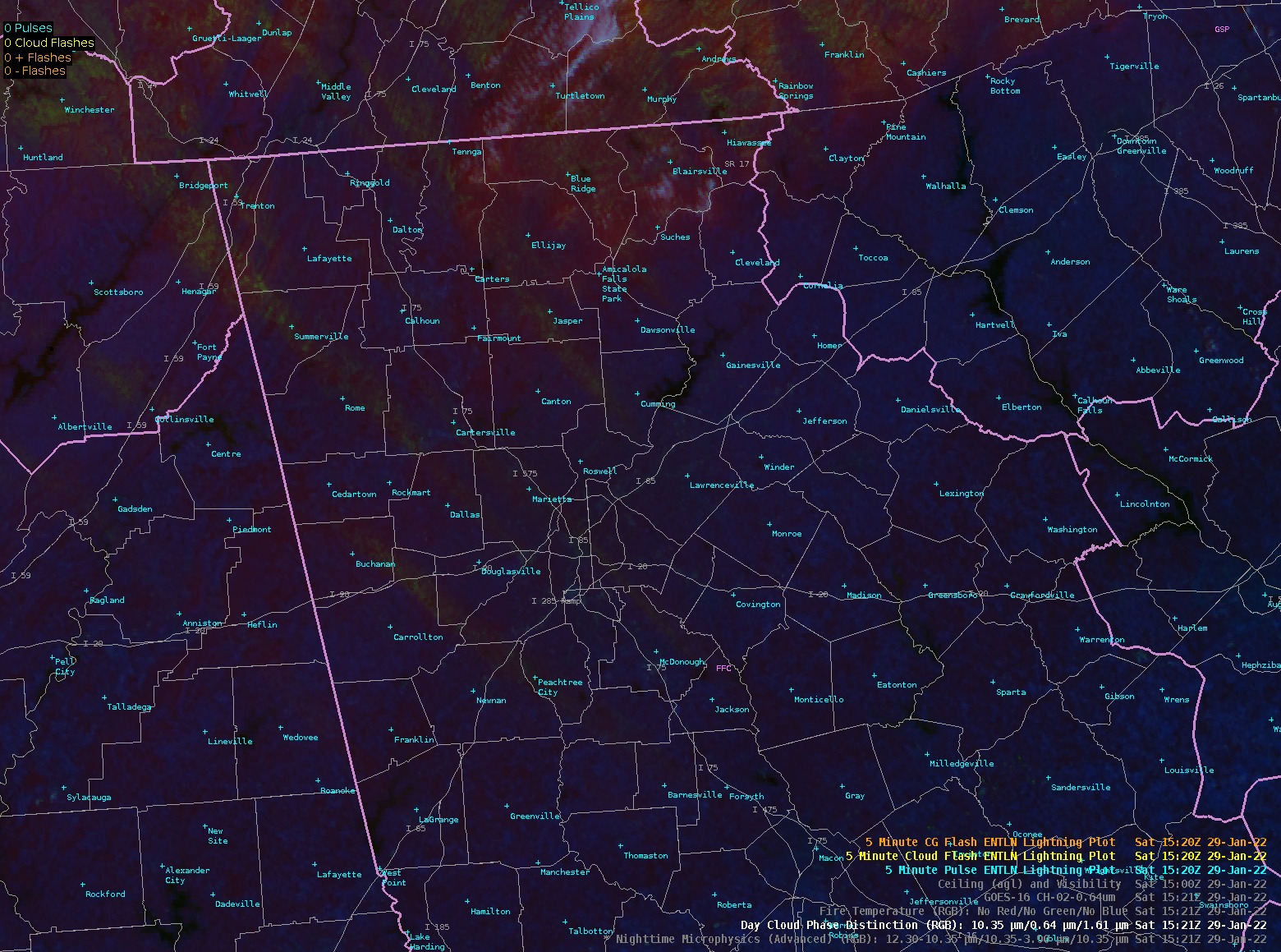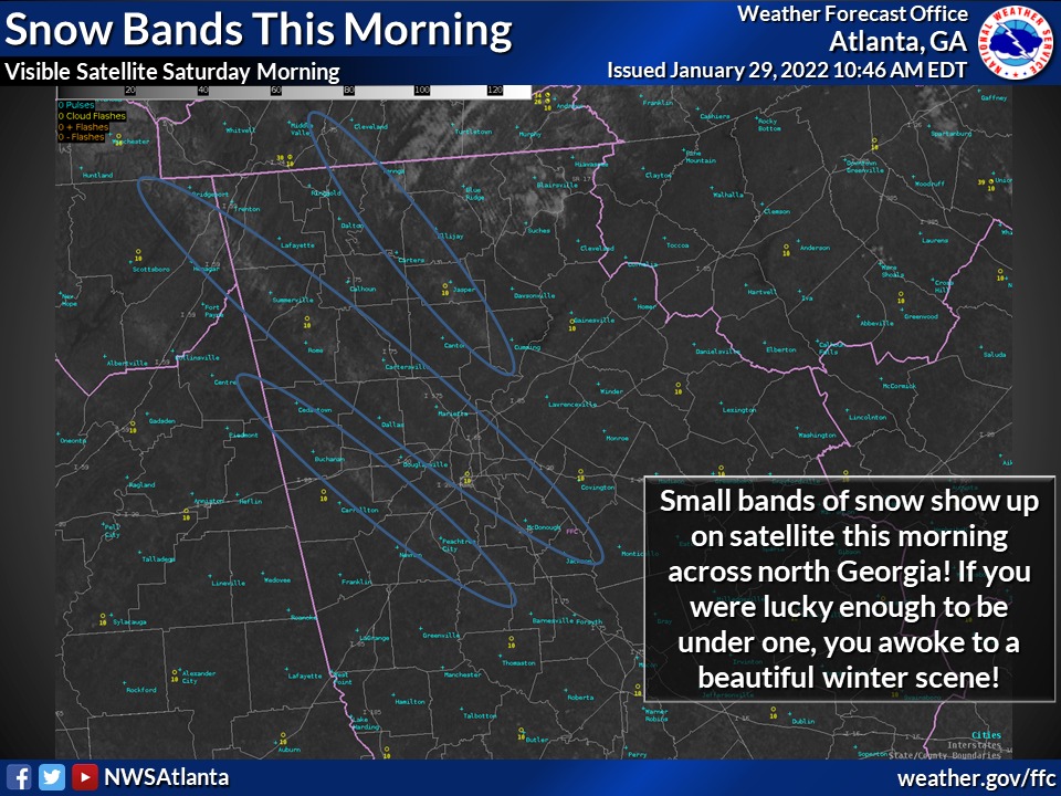 Thin bands of snow crossed over North Georgia and metro Atlanta early Saturday, Jan. 29, 2022. (NWS Peachtree City)Snow on the ground stands out as green(ish) bands (with more coverage in the mountains) in this image from the National Weather Service’s Day Cloud RGB satellite view.