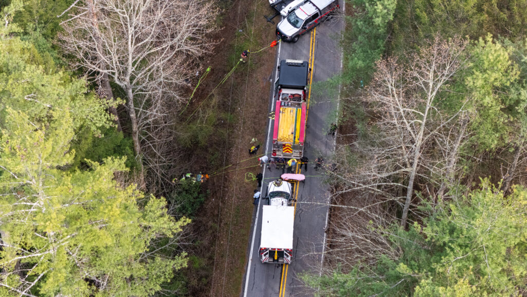 The vehicle came to rest in a difficult-to-reach area below the roadway, prompting responders to deploy high-angle rope systems to safely access and extricate the driver.