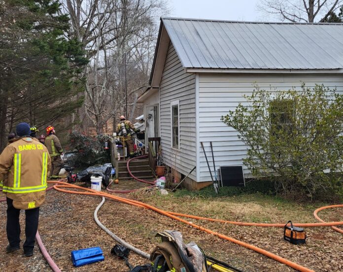 Around 1:45 p.m. Tuesday, firefighters responded to a report of a structure fire at 973 Highway 51 North. When they arrived, they found a single-family residence with smoke showing from the rear of the structure, says Banks County Fire Chief Steve Nichols.