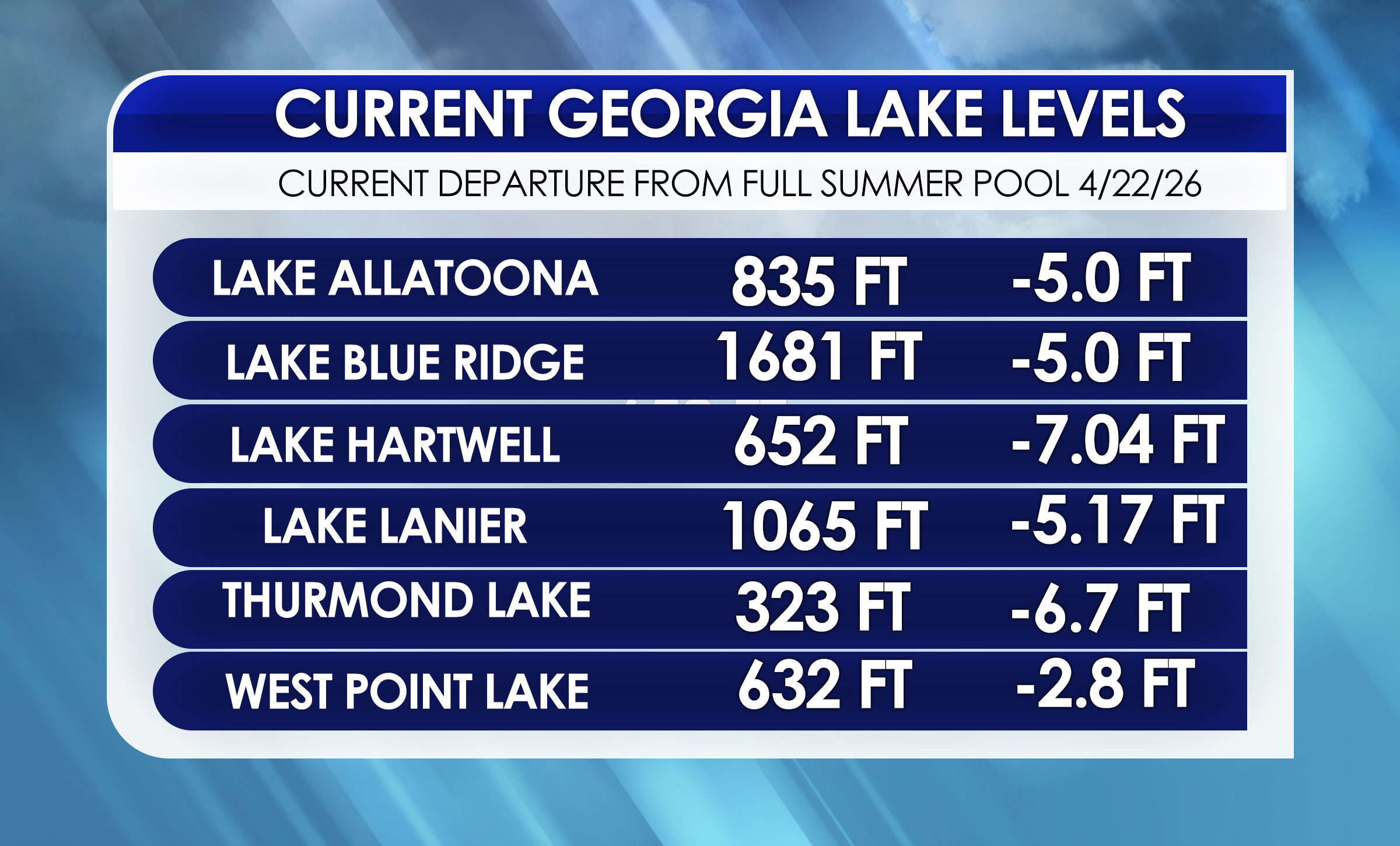 As of April 22, most of the lakes monitored by the Army Corps of Engineers were reporting below full summer pool. In many cases, this is by a sizeable number. Lake Hartwell reports the largest deficit at 7.04ft below full pool and Lake Thurmond is 6.7ft under. Elsewhere Lake Lanier is 5.17ft under and West Point Lake is 2.82ft under. This is nowhere near the levels reported during the record setting 2008 drought, but with upcoming rainfall remaining well below what we would need to see drought improvement and trees/plants taking in more water, those numbers will continue to go down.