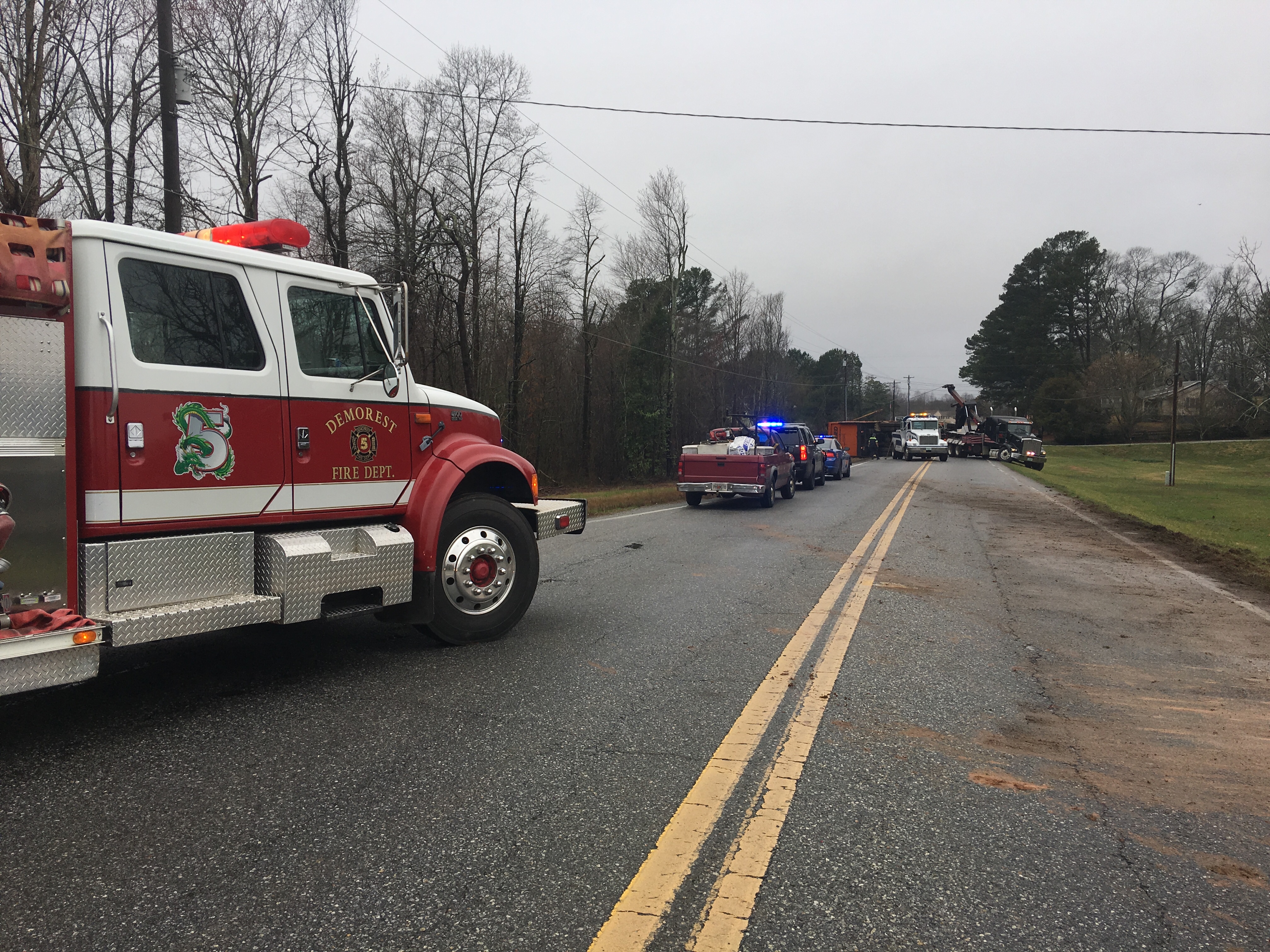 The Georgia State Patrol, Demorest Fire, Habersham County Emergency Services and Sheriff’s Office responded to the scene. They shut down Cannon Bridge Road between Cap Fry and Pea Ridge Roads while a tow truck pulled the truck upright and crews cleared the scene.